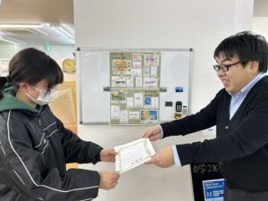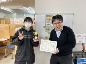 後日、改めて賞状とトロフィーを授与。