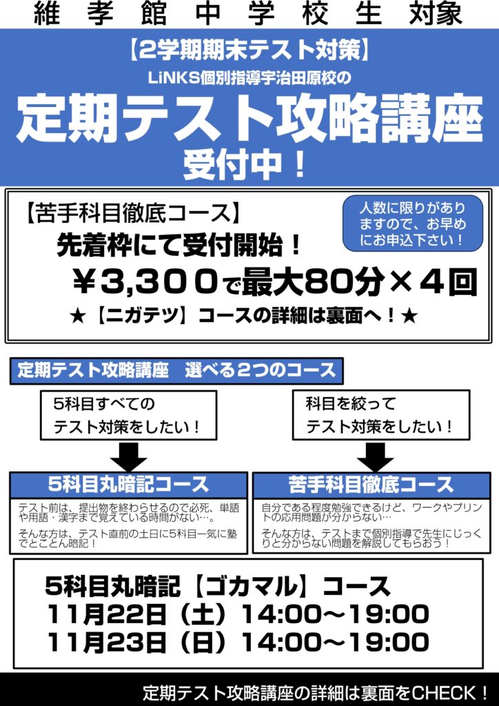 | 11月4日(火)~ | 2学期期末テスト テス対+/ニガテツ講座受付開始 |